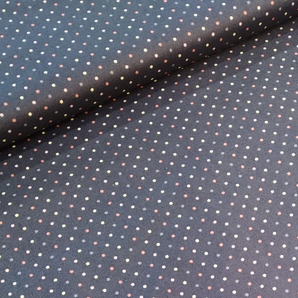 Tela de patchwork de fondo azul con estampado de motas de colores