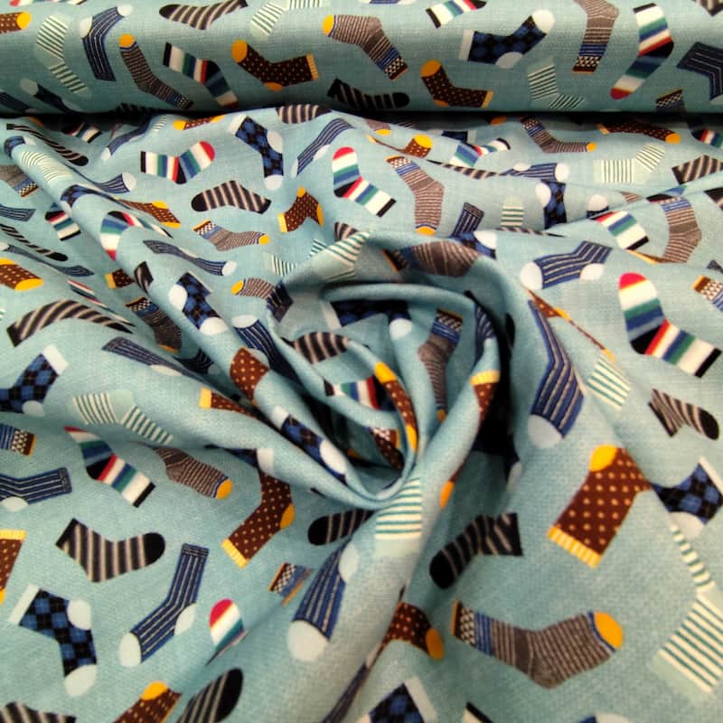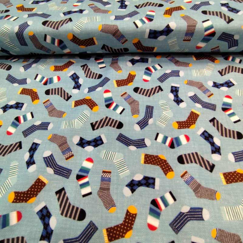 Tela azul estampada con calcetines de colores