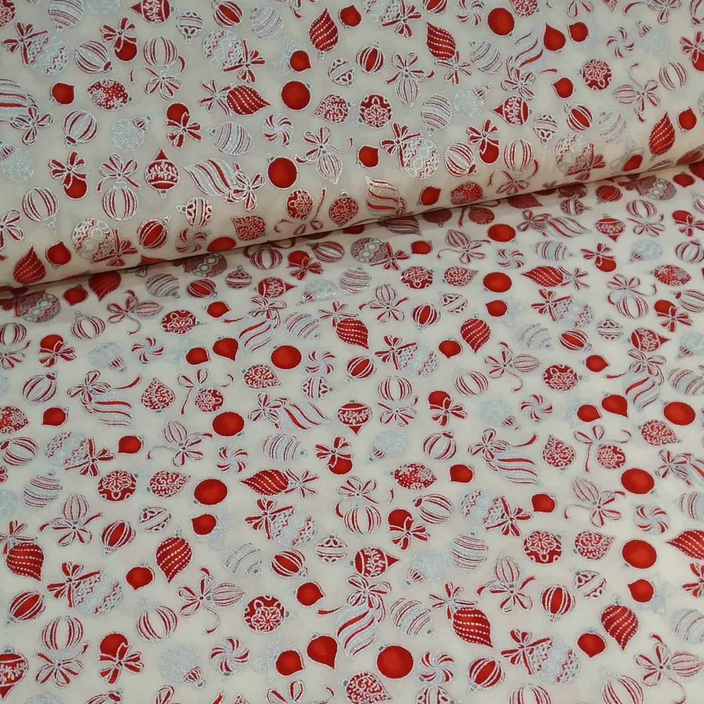 Tela navidad de fondo crema con estampados en rojo de algodón 100%