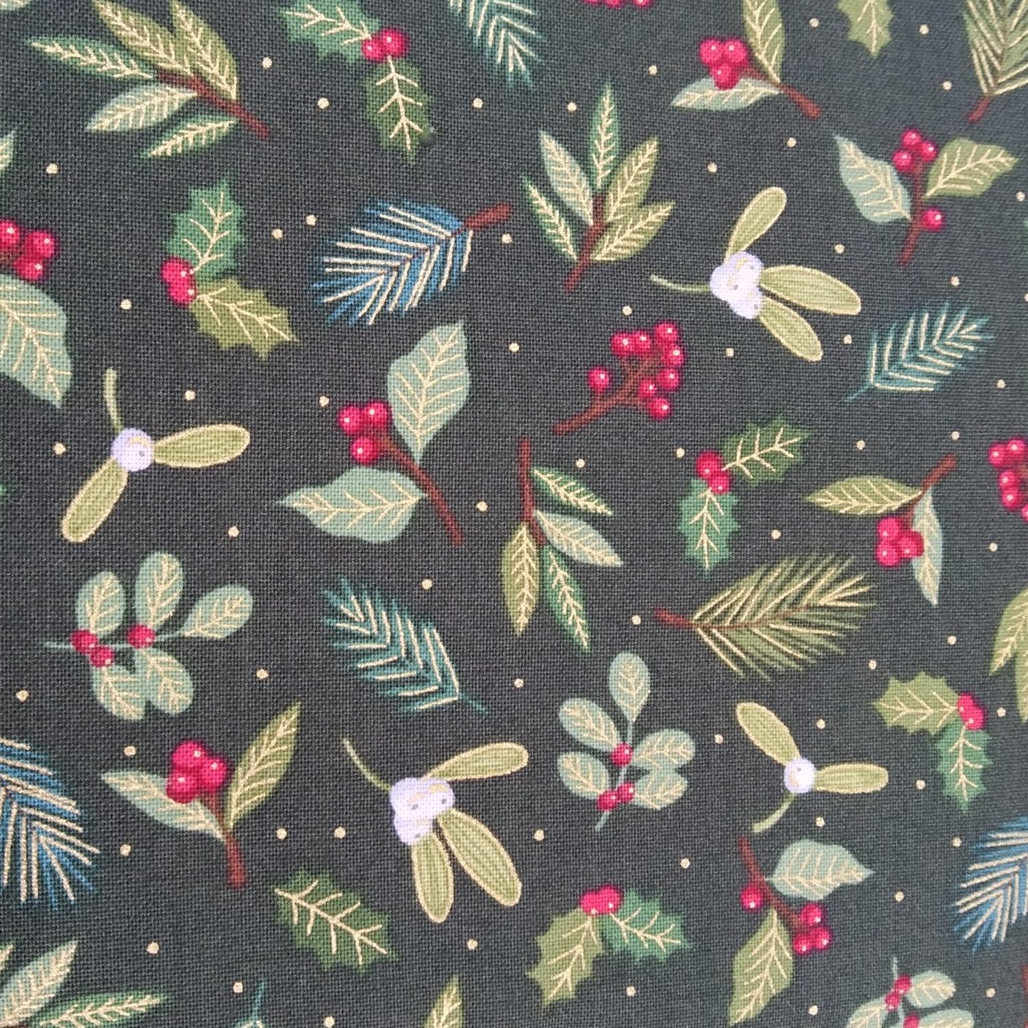Tela con motivos navideños con estampado de acebo en tonos verdes