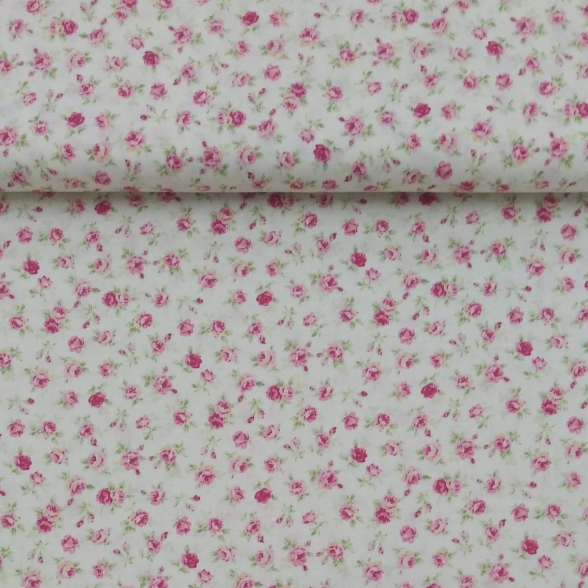 Tela de fondo crudo con estampado de florecillas en tonos rosas y verdes